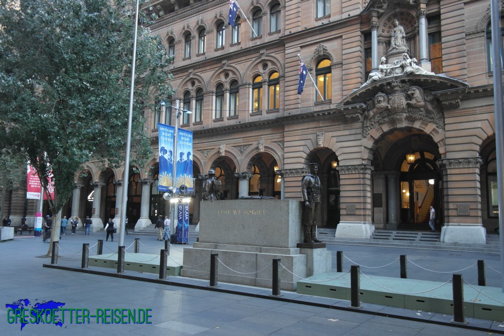 Um kurz nach Vier erreichten wir den Circular Quay und gingen schweren Herzens zurück zu unserem Hotel. Wir machten noch einen Bogen am General Post Office vorbei und bogen auf den Martin Place zum Hotel ab. Dann holten wir die Koffer und machten uns auf dem Weg zum Flughafen. Vom Hotel ging es mit der U-Bahn zum Hauptbahnhof, dort mussten wir in die Bahn zum Flughafen umsteigen. Komischerweise hatte aber genau die Plattform, an der die Züge zum Airport Halt machen keine Rolltreppe. Also hievten wir unsere großen Koffer nach oben und wenig später saßen wir auch schon in der Bahn und verließen Sydney.