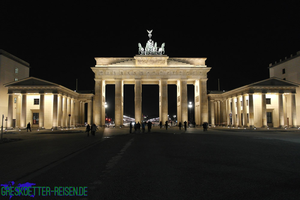 Nachdem Karin endlich eine Mütze gefunden hatte, fuhren wir mit der U-Bahn zum Potsdamer Platz. Draußen leuchtete das bunt beleuchtete Sony Center im mittlerweile dunklen Berlin. Wir gingen in Richtung Brandenburger Tor und kamen zum Holocaust Mahnmal. Wir schlängelten uns über den platt getretenen Schnee durch die hohen Steinblöcke, von außen nur spärlich beleuchtet. Im Dunkeln schon ein sehr beklemmendes Gefühl.