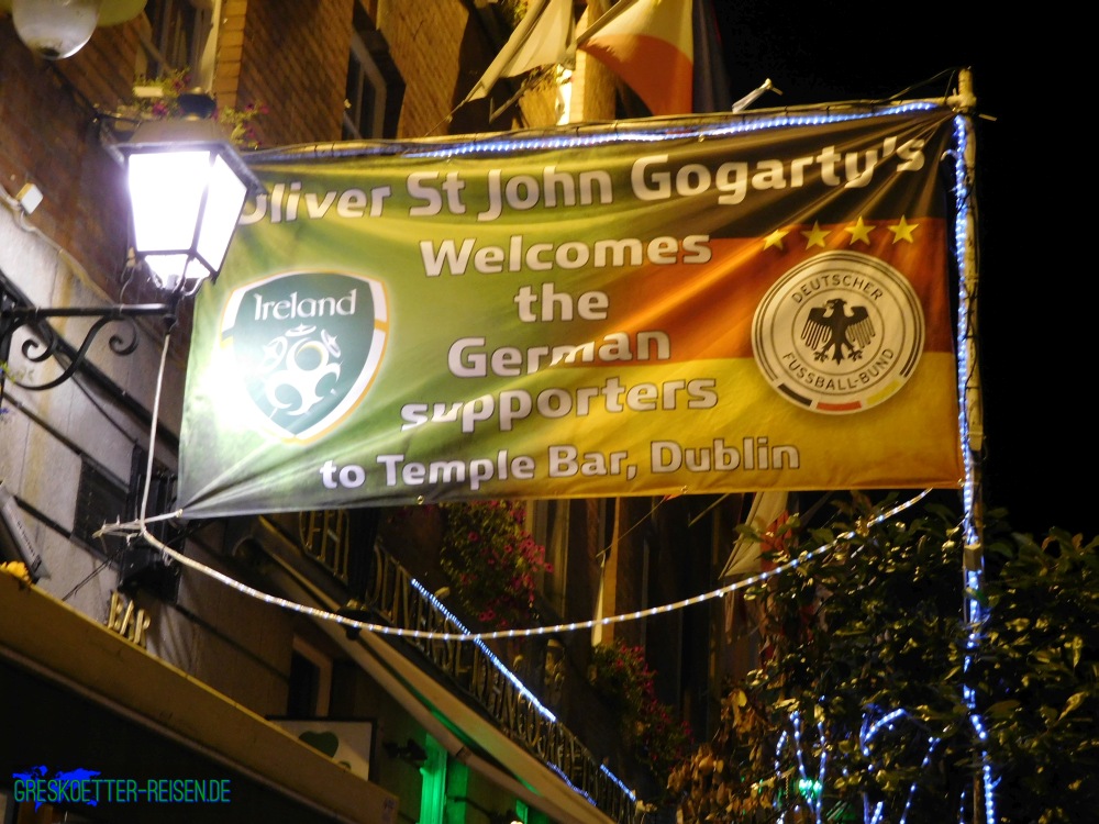 Der erste Hunger war gestillt, also konnte es weiter gehen. Wir gingen durch die vollen Straßen und kehrten im Oliver St. John Gogarty ein, neben der Temple Bar wohl der bekannteste Pub in Dublin. Auf einer großen Flagge wurden die deutschen Supporter begrüßt, dementsprechend viel deutsch wurde hier auch gesprochen. Wir ergatterten uns einen Platz draußen und überall war schwäbisch, bayrisch oder sonstiges kauderwelsch zu hören. Also stellten wir kurzerhand auf Plattdeutsch um. Wenn wir die schon nicht verstehen konnten, sollten die uns auch nicht verstehen.