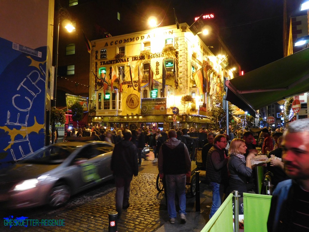 Temple Bar wurde seinen berühmt berüchtigten Ruf gerecht. Eigentlich wollten wir schon im Hotel sein, aber die Stimmung in den Pubs war einfach gigantisch. Wer schon mal in Dublin ist, sollte sich das nicht entgehen lassen. Auch wenn hier viele Touristen sind, bekommt man doch einen klasse Einblick in die irische Pubkultur. Vor allem am Wochenende tobt hier der Bär.