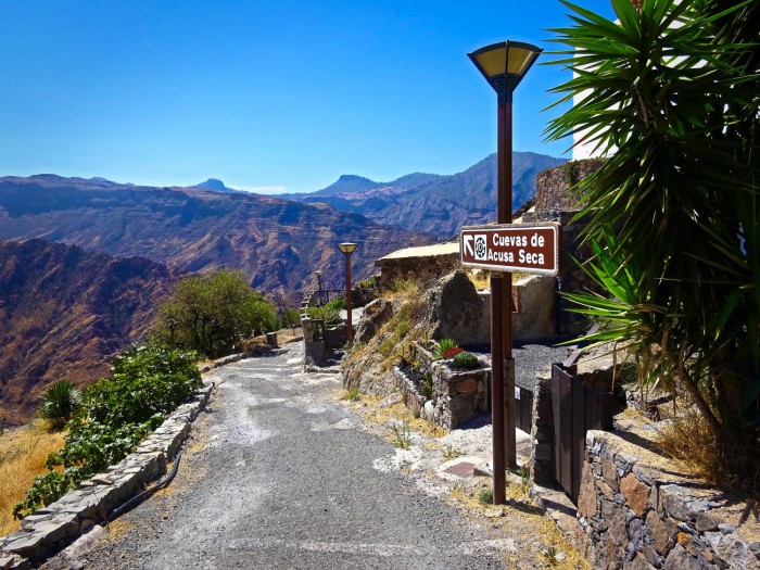 Irgendwann kam in der Ferne der Roque Bentayga und der Roque Nublo in Sicht. Kurze Zeit Später hatten wir dann die Abfahrt zu den Höhlen von Acusa Seca gegen 12:15 erreicht. Wir fuhren die kleine, steile Straße hinunter bis zum Parkplatz und stellten unser Auto ab.