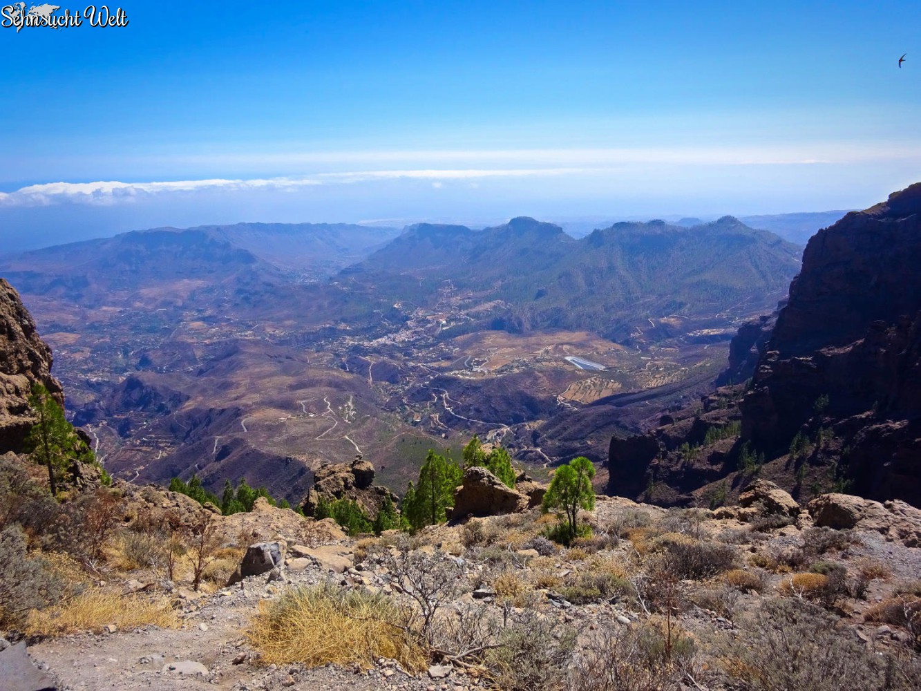 Schon vom Parkplatz bot sich ein wunderbarer Blick in das Tal und den auf der anderen Talseite liegenden Roque Bentayga. Dahinter ragte der wohl bekannteste Felsen und das Wahrzeichen der Insel in der Ferne auf, der 65 m hohe und auf über 1.800m Höhe gelegene „Wolkenfels“ Roque Nublo. Schon allein für diese Aussicht hatte sich der Zwischenstop gelohnt. Und in der Ferne schweifte der Blick auf das Bergdorf Tejeda. Traumhaft.