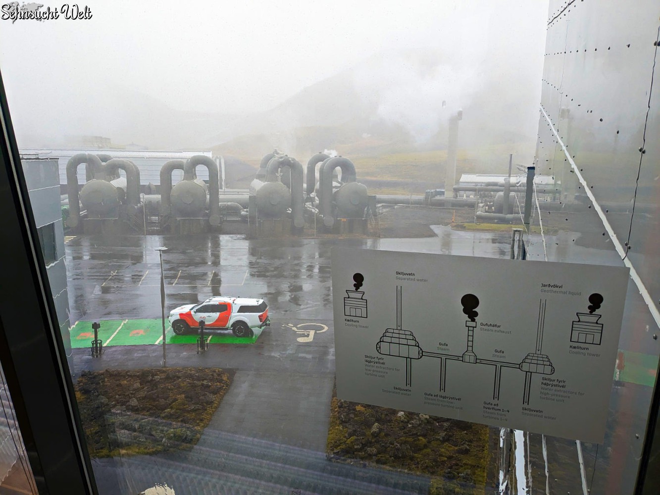 Gegen 9:30 fuhren wir dann los und wollten erst noch zur Apotheke, ein Mittel gegen Reiseübelkeit holen. Doch die Apotheke hatte zu, also fuhren wir so los. Von der Umgebung war nicht viel zu sehen, denn alles hüllte sich in dichten Nebel. Irgendwann kam dann das Geothermalfeld in Sicht und wenig später erreichten wir den Abzweig zum Kraftwerk. Wir parkten auf dem fast leeren Parkplatz und passend dazu fing es an zu schütten. Also in unsere Regenjacken und schnell zum Eingang gespurtet. Hellisheiði ist eines der größten Geothermalkraftwerk weltweit und man kann hier einiges über die Nutzung der Thermalfelder für die Energiegewinnung und Warmwasseraufbereitung erfahren. Das Informationszentrum ist nicht gerade riesig, so waren wir auch recht schnell durch. Die Jungs interessierten sich nicht für das Kraftwerk, sondern malten im Kinderbereich und drehten auf einer virtuellen Wand Rohre auf und zu. Außerdem konnte man noch durch eine Scheibe auf eine der großen Turbinen schauen. Bei schlechtem Wetter ganz nett, man sollte aber nicht zu viel erwarten.