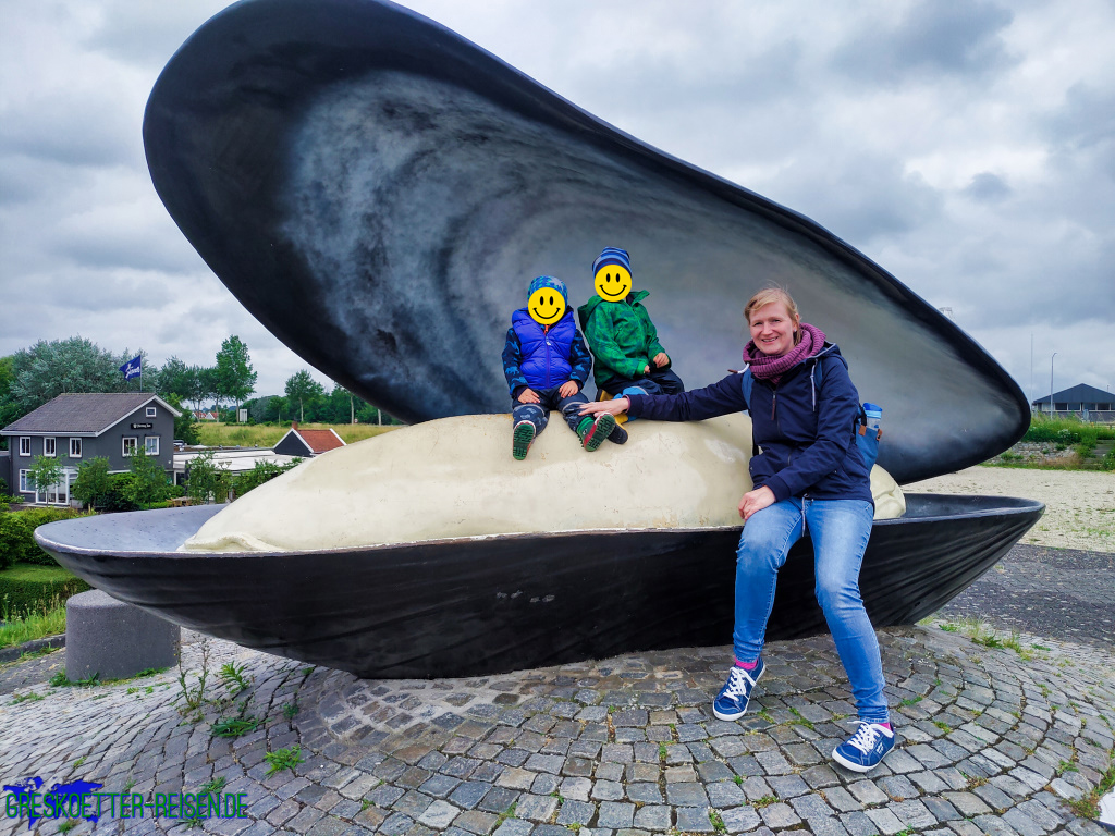 Gut gestärkt entschlossen wir uns, noch den Ort zu erkunden. Also packten wir die Jungs in den Bollerwagen und zogen gegen 18 Uhr los. Durch eine Unterführung ging es unter der Hauptstraße hindurch und nach wenigen Minuten waren wir am Hafen. Hier ist alles im Zeichen der Muschel. Auf dem Deich begrüßte uns schon eine überdimensionale Miesmuschel und am Hafen lagen einige Fischerboote. Auch ein Fischrestaurant und ein Geschäft mit frischen Meeresfrüchten gab es hier.