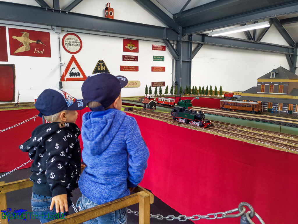 Wir betraten das Museum und waren fast die Einzigen, die sich hierher verirrt hatten. Zuerst mussten wir die Treppe hochlaufen. Hier war eine Modellanlage aufgebaut und die Jungs waren direkt begeistert. Beide bekamen große Augen, kletterten auf die kleinen Podeste, die extra für die Kinder hier standen, und liefen den Zügen hinterher.