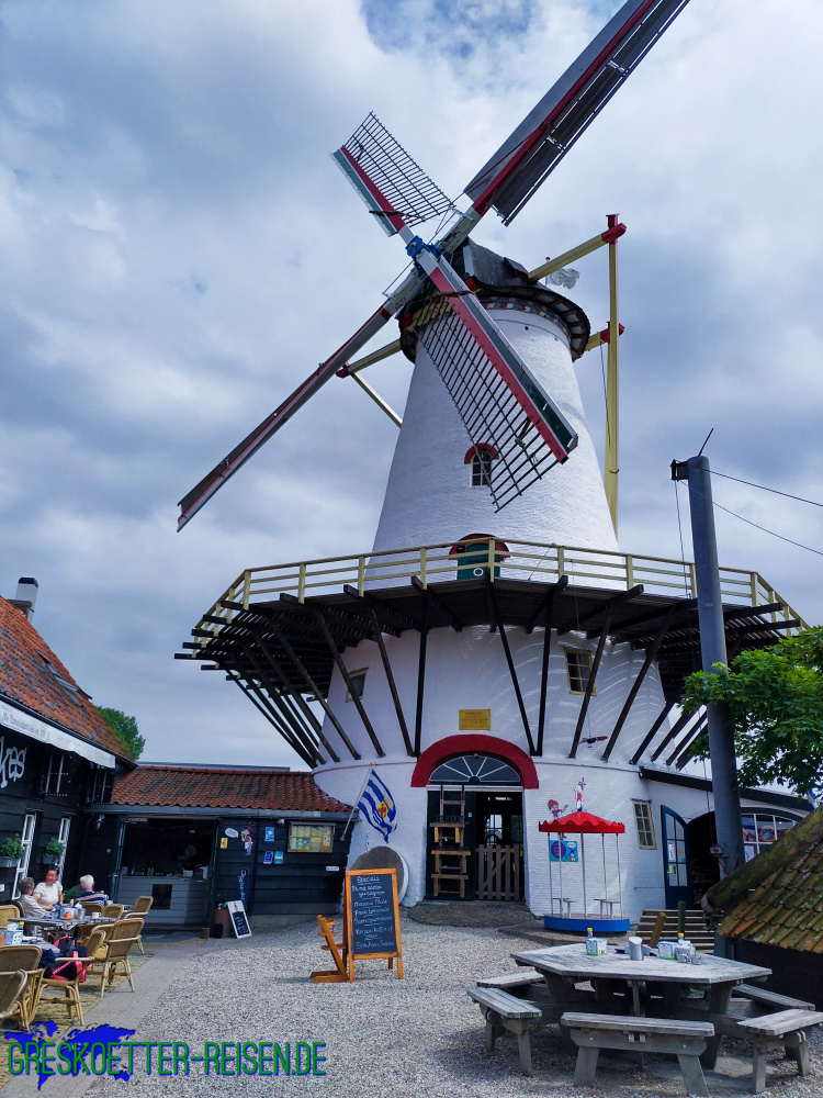 Julian hatte mittlerweile eine riesige Tüte voller Muscheln gesammelt und musste mir noch unbedingt die Quallen zeigen, die direkt am Damm herumschwammen. Mittlerweile war es auch schon nach 15 Uhr und wir hatten ordentlich Hunger. Also fuhren wir ins nahe Burgh-Haamstede zur Pannekoekenmoelen. Irgendwann war die Mühle in Sicht und wir parkten unser Auto und stellten uns an den Anmeldethresen.