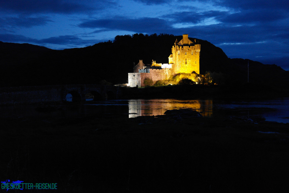 Um viertel nach 4 machten wir uns dann aber wieder auf den Rückweg. Wir kauften noch schnell in Kyle of Lochalsh ein und erreichten nach etwa 1,5 Stunden wieder unser Mobile Home. Da es unsere letzte Nacht in Ardelve war, musste ich nach dem Abendessen natürlich wenigstens noch mal zum Eilean Donan Castle fahren. Die Sonne war schon untergegangen und die Burg war toll beleuchtet. Also machte ich noch ein paar Fotos von allen Seiten, dann ging es wieder zurück, den letzten Abend in den wunderschönen Highlands ausklingen lassen.