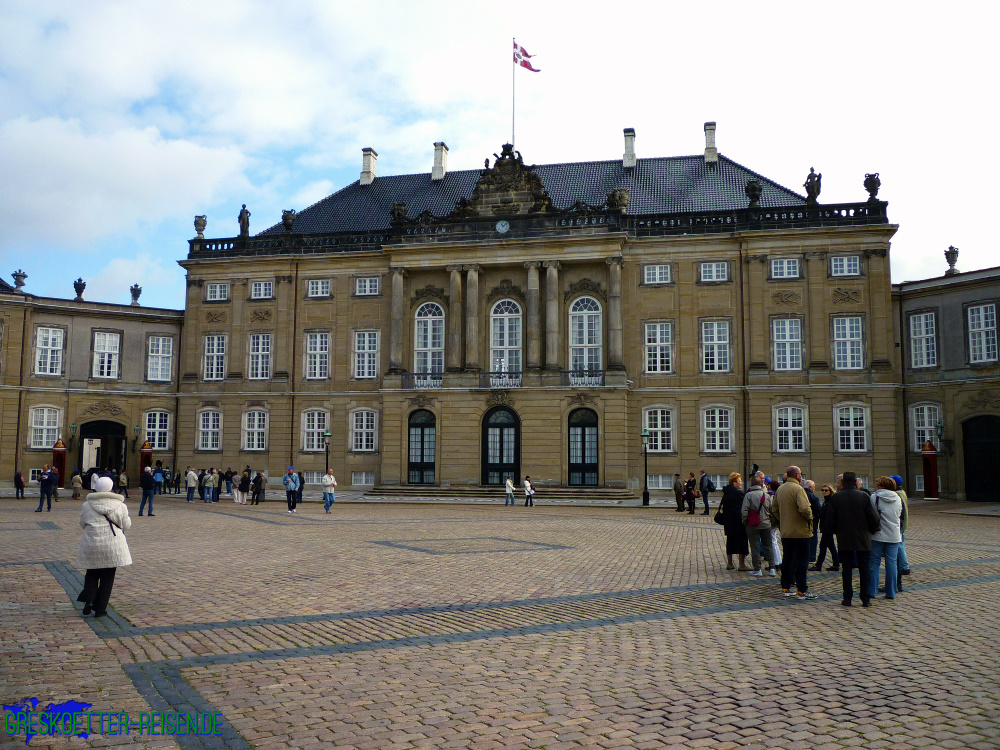 Von hier aus gingen wir dann zu Fuß zur Amalienborg, dem Wohnsitz der dänischen Königsfamilie. Wenn die Königin in Kopenhagen weilt, ist hier um 12 Uhr Wachablösung. Schon eine Stunde vorher war viel los, also schien die Wachablösung stattzufinden. Da wir noch etwas Zeit hatten, gingen wir zum Kongens Nytorv und kauften uns für unsere letzten 30DKK zwei große Stücke Pizza im 7Eleven.
